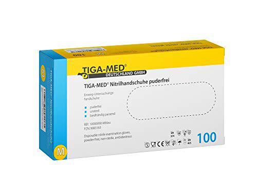 Guantes de nitrilo sin talco Tiga-Med Azul - Guantes desechables de nitrilo (100 unidades) tamaño: Medium desechables de guantes sin látex de Tiga Med